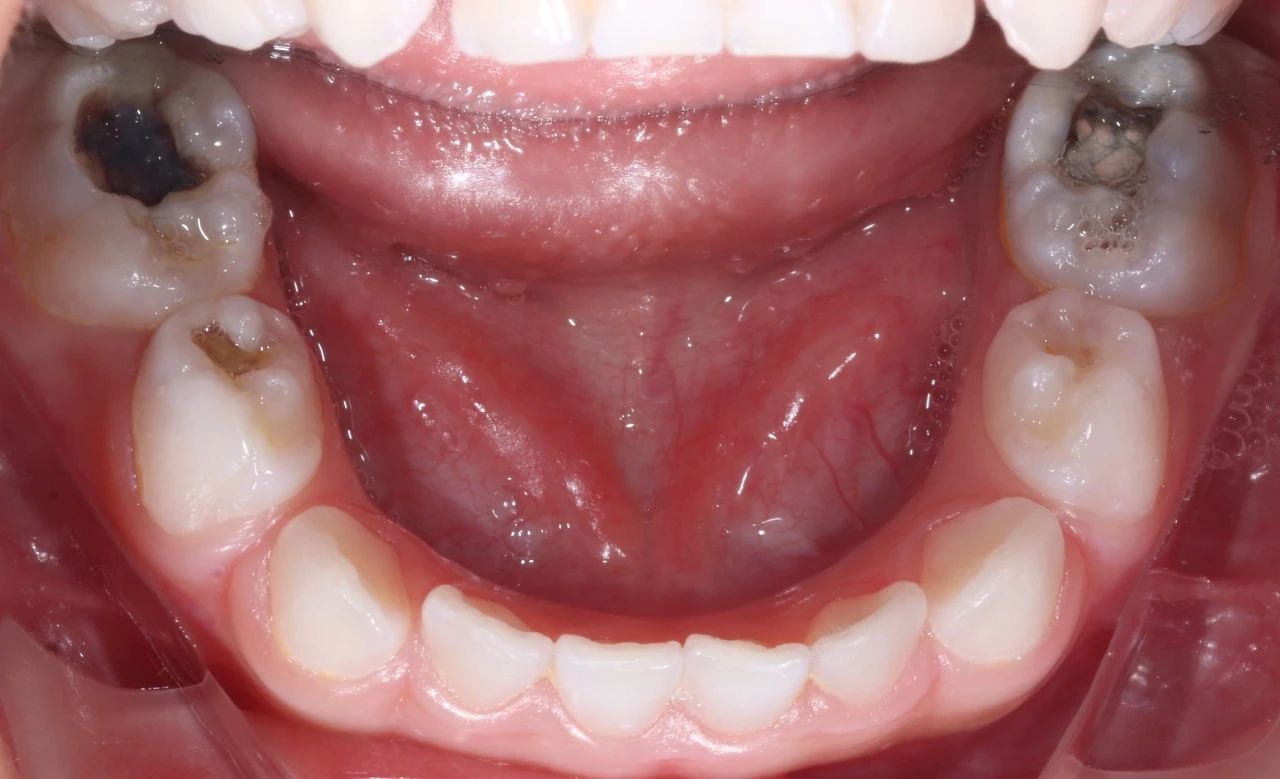 由于孩子不配合,这次就诊时,孩子在姥姥的按压下,只能接受了一小步止疼治疗。但是,从孩子的口腔情况来看,他的好几颗牙齿都龋坏得非常严重,而且其中有三颗牙甚至已经坏到了需要做根管治疗的程度。