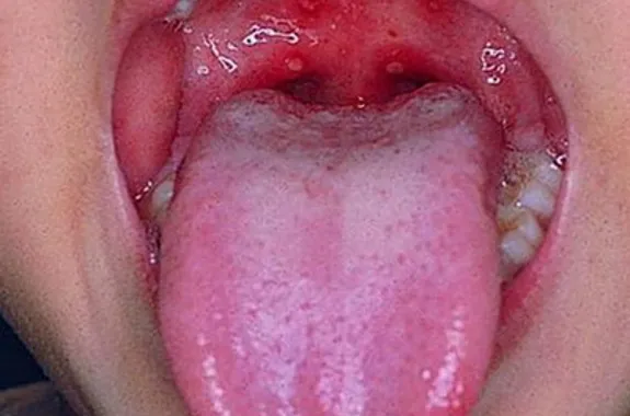 ▶ 一般临床表现为:初期先高烧(可达39°左右),但是24小时之内去医院,可能血象仅显示为 病毒感染 ,此时,孩子口腔里可能并没有疱疹,可能在24小时以后才出现疱疹或者红点儿,出疹后会导致孩子疼痛难忍,尤其是小年龄孩子,可能会出现流口水、拒食、拒奶等表现。