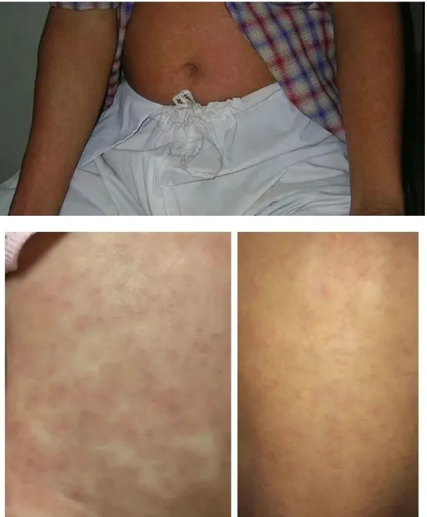 皮疹:一般情况下,患病后2天~5天在躯干、四肢伸侧、手掌和足底出现红色斑丘疹或紫癜,可能伴有瘙痒感、出现脱屑,数天后消退。