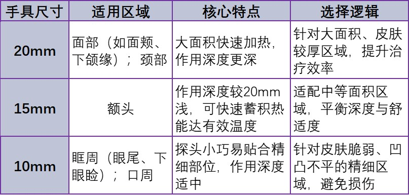 目前TempSure 舒玛吉有3款手具通过中国NMPA认证的,尺寸分别为10mm、15mm、20mm,选择核心依据“治疗区域的面积、皮肤厚度及精细度需求”,具体对应如下: