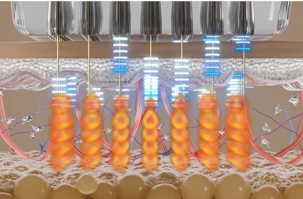 微针针尖还能释放射频能量,将产生的热能准确地传输到不同深度的皮肤层次,这种可逆性热损伤会启动皮肤的修复机制,促进新的胶原蛋白合成,并诱发胶原蛋白重塑,从而实现皮肤年轻化[1,2]。