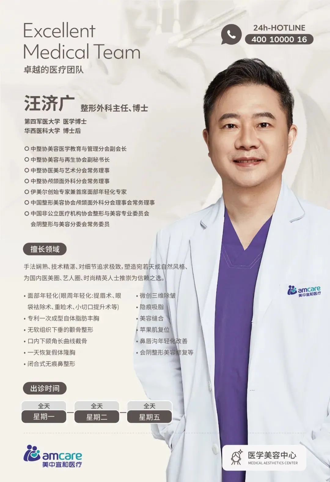 美中宜和医美中心专家团队又添新力量特邀专家——整形外科汪济广主任2025年7月起开始在北京宜和医院出诊啦! 医生简介 汪济广主任在第四军医大学获得博士学位,并于